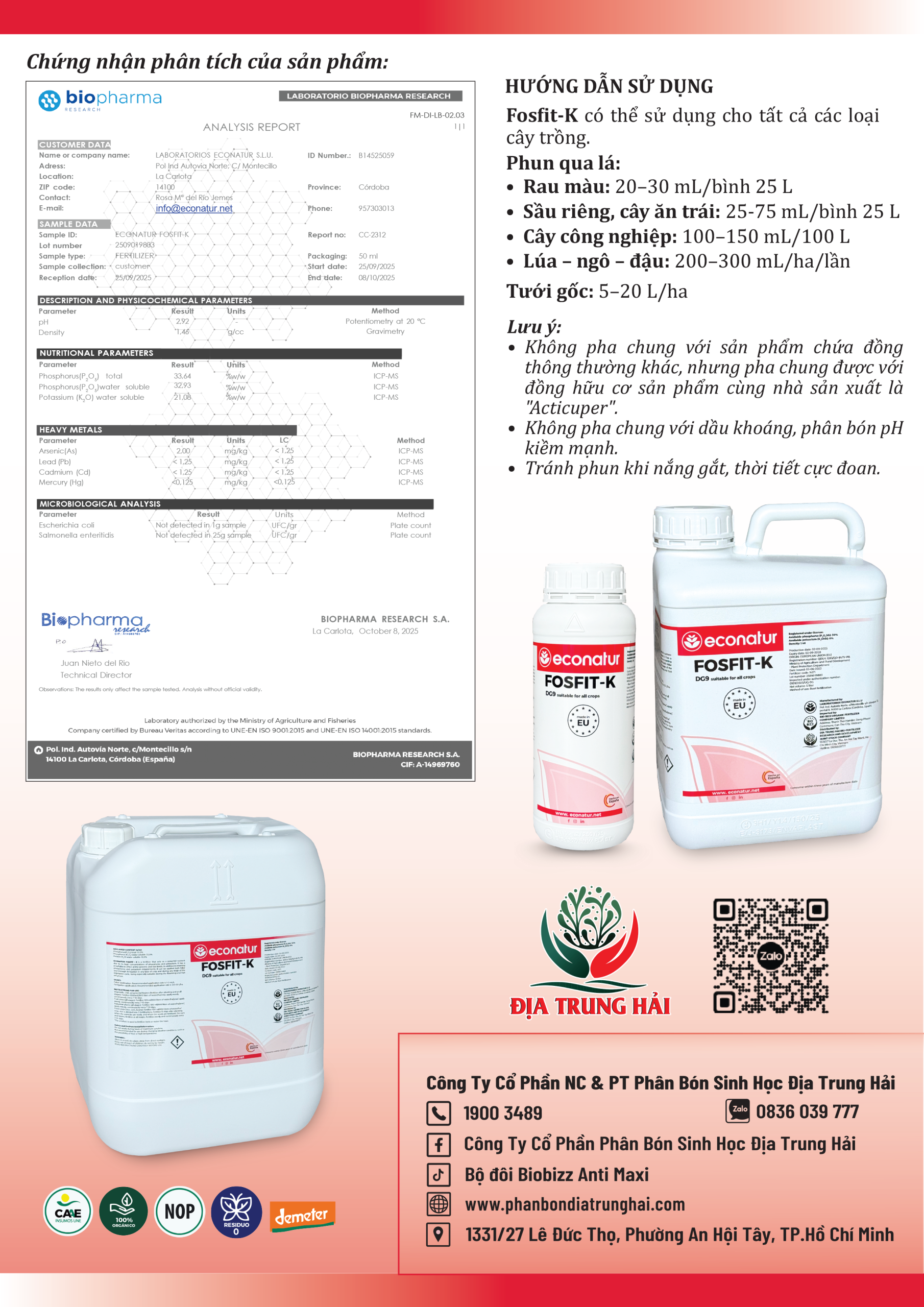 • Không pha chung với sản phẩm chứa đồng thông thường khác, nhưng pha chung được với đồng hữu cơ sản phẩm cùng nhà sản xuất là “Acticuper”